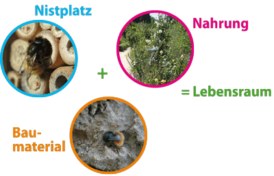 Für Wildbienen entsteht Lebensraum dort, wo ihre drei Abhängigkeiten erfüllt sind und in unmittelbarer Nähe (200 bis 300 Meter Distanz) erreichbar sind: